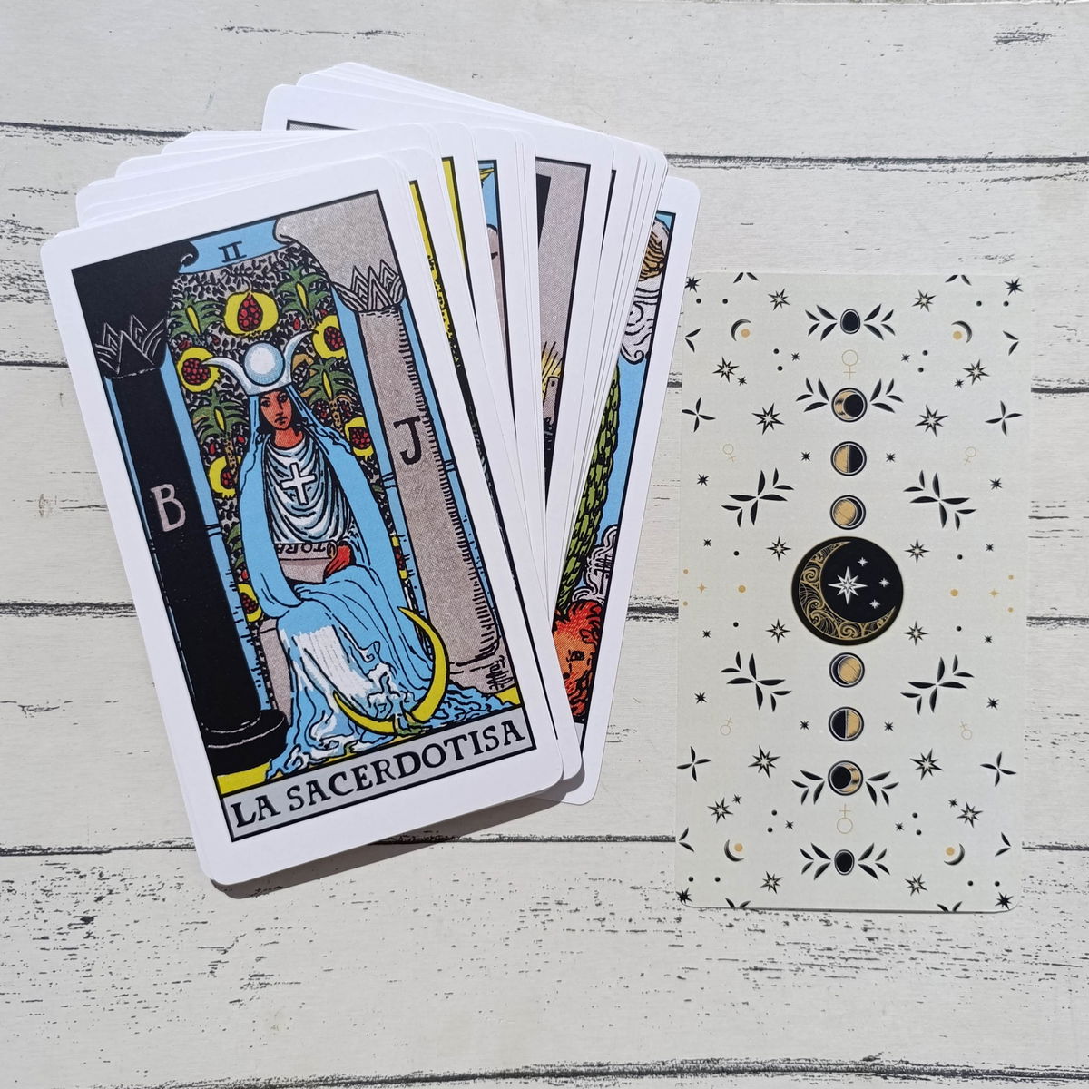 Este Mazo mediano de Papisas está diseñado para la enseñanza de Tarot Rider.