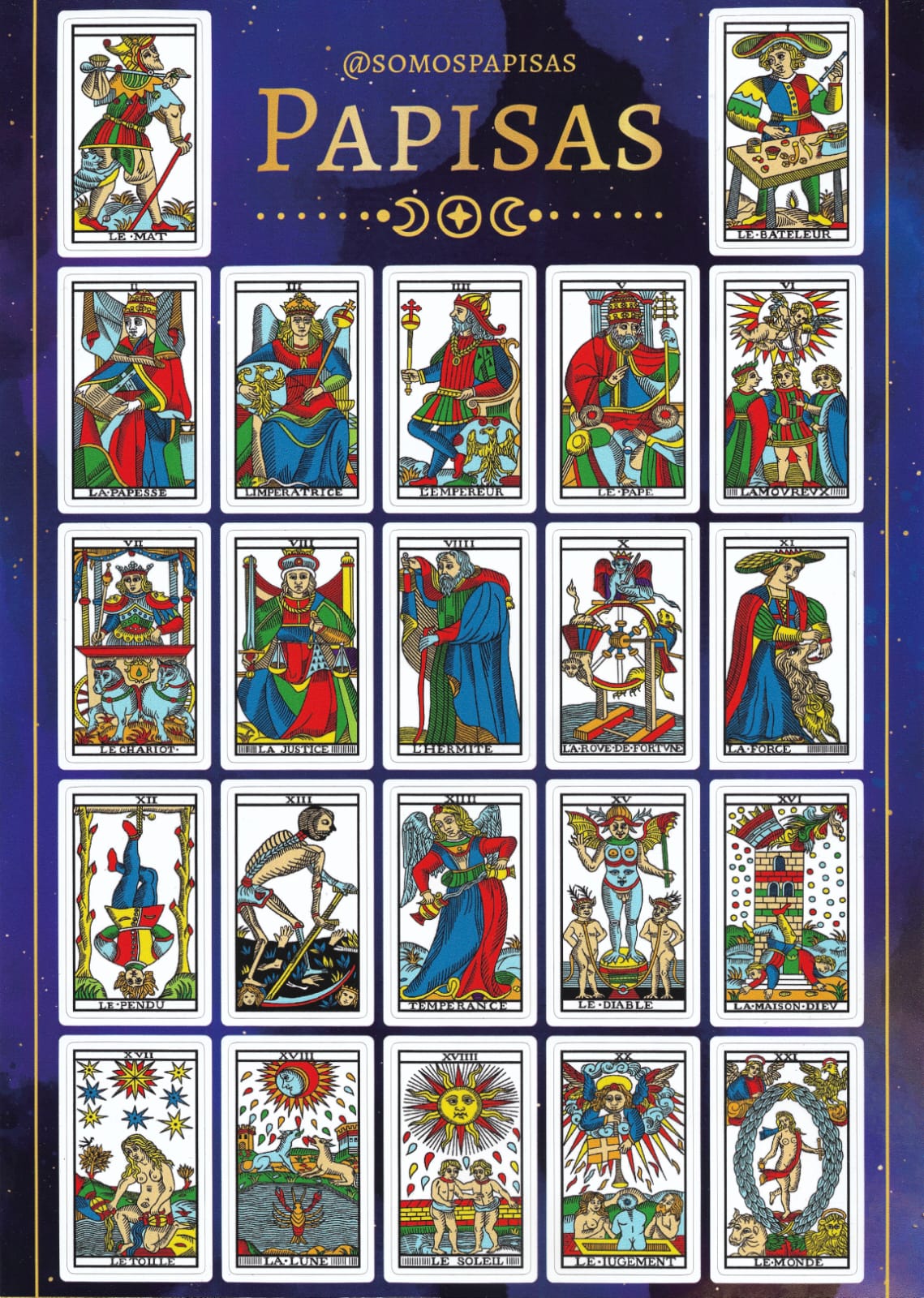 Planchas de Stickers Marsella troquelados de los 22 Arcanos Mayores de Papisas.